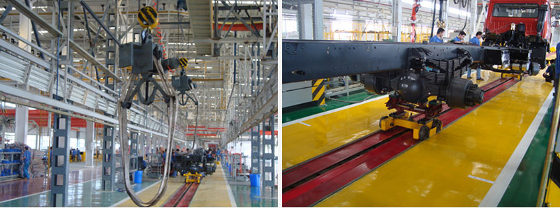The project consists of a total assembly line and a body assembly line. The general assembly line is used for the assembly and inspection of the chassis of the whole vehicle. It consists of two parts. The front part adopts the form of single-chain traction trolley, which can adjust the distance between the trolleys and the vertical return type towline. The rear part adopts the double-chain chain form. The assembly line product is put on the line for lifting equipment, and the product is off the assembly line for the driver's driving products. The product is supported by two to four trolleys on the assembly line to complete the assembly work of the cab, tires, and compartments. In order to make the product automatically and smoothly transition between the two-way board chain and the ground chain, a downward gentle slope is arranged at the end of the ground chain and the overlapping section of the two-way board chain.